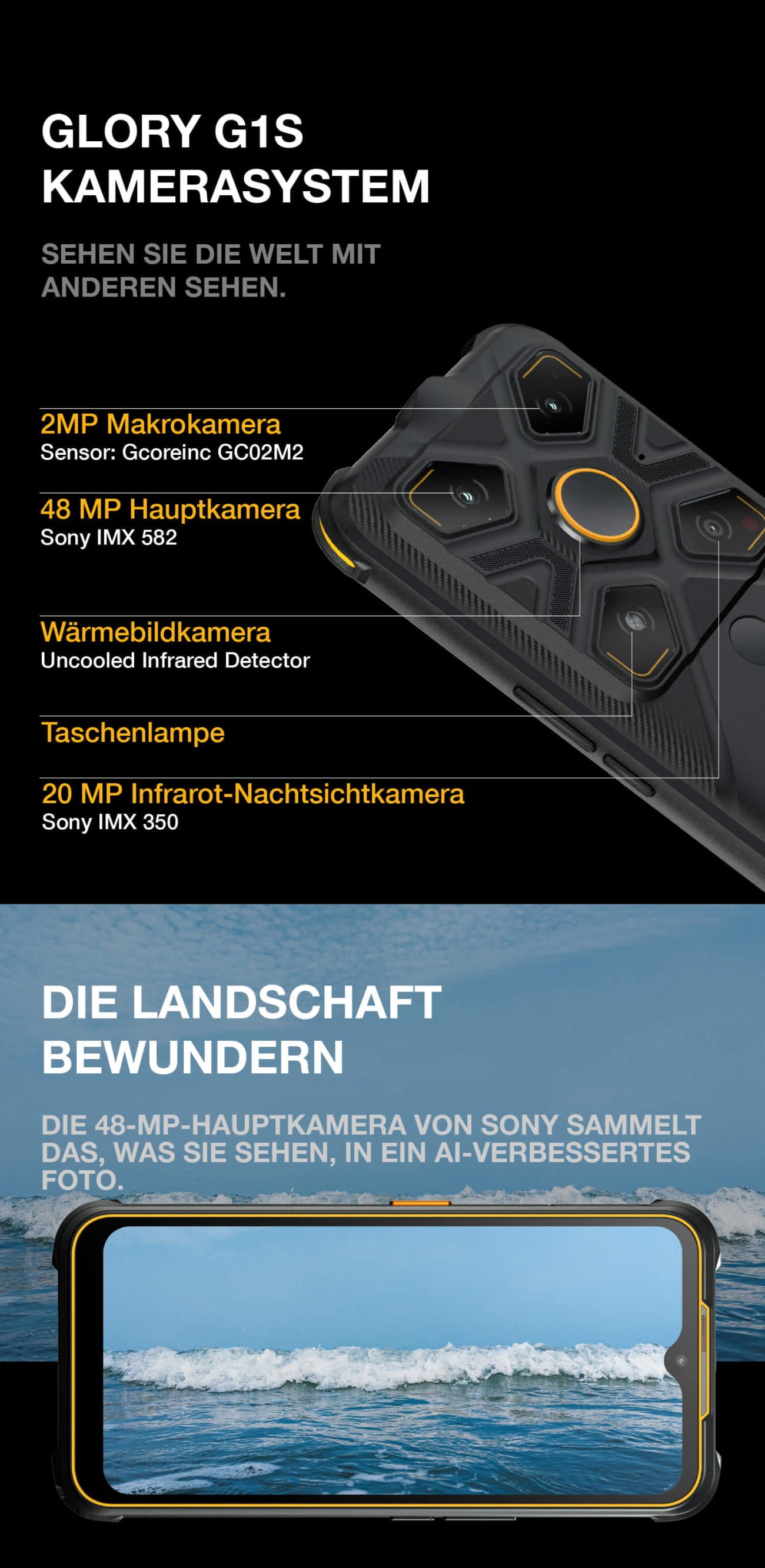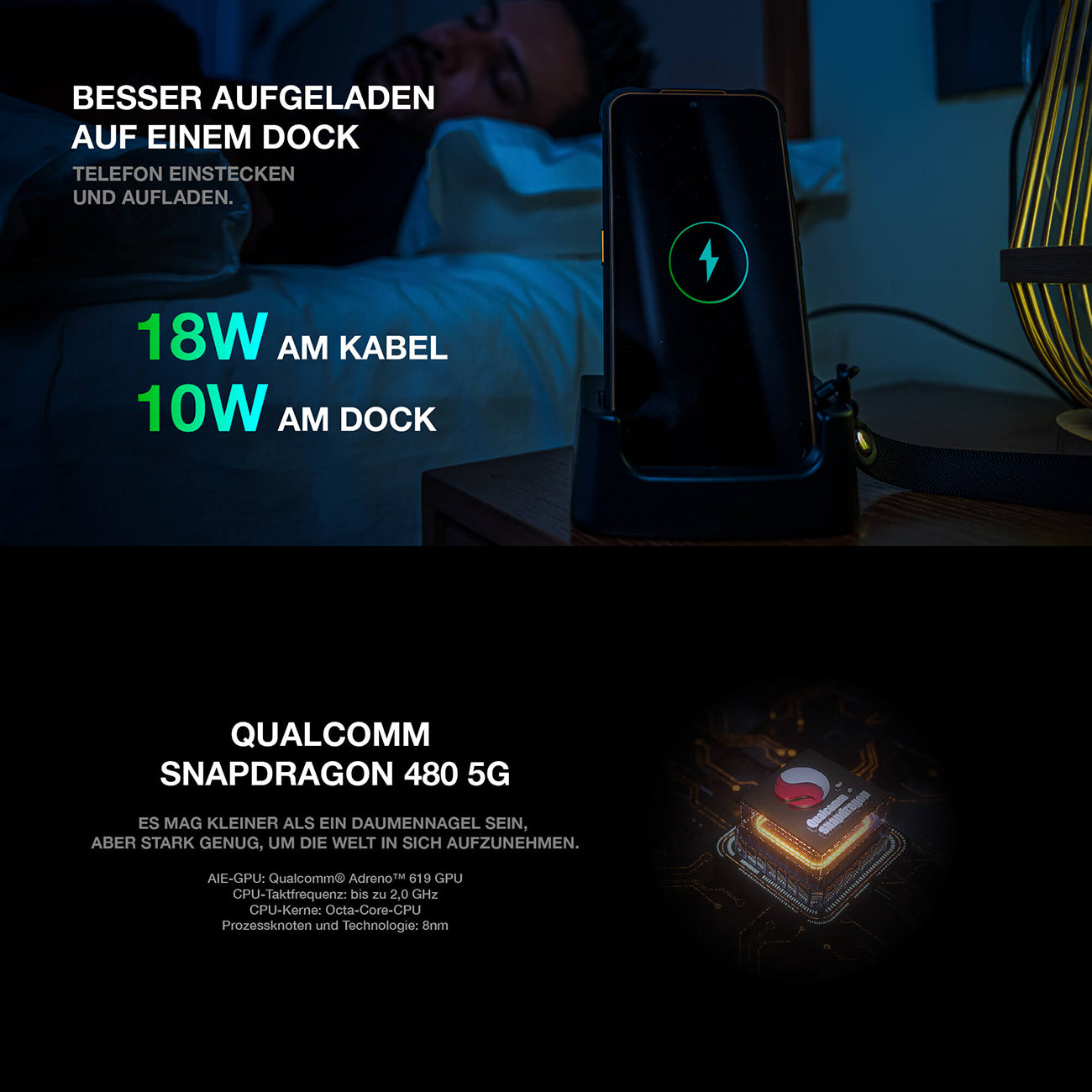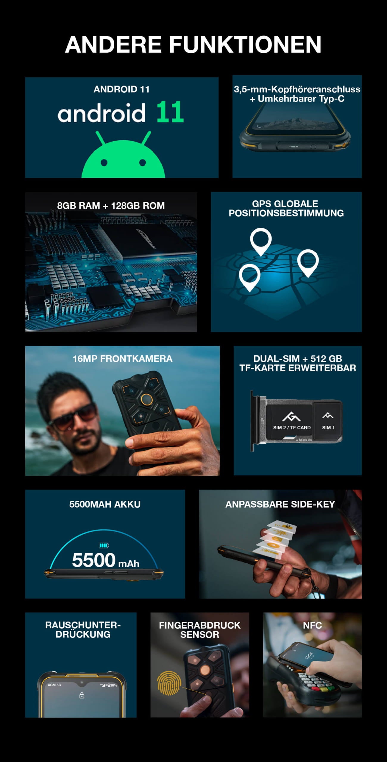 【6GB RAM +128GB ROM+Kabelloses Laden+5500mAh Akku】Mit 6GB RAM und 128GB ROM Speicher können Sie mehr Dateien speichern und eine 512GB-TF-Karte hinzufügen. AGM Glory G1S Robustes Handy Es ist mit einem 5500-mAh-Akku ausgestattet, sodass Sie sich im Freien keine Gedanken über die Akkulaufzeit machen müssen. Und auch seine Lademethoden sind sehr vielfältig: 18-W-Schnellladen, Cradle-Charging und kabelloses Laden.
