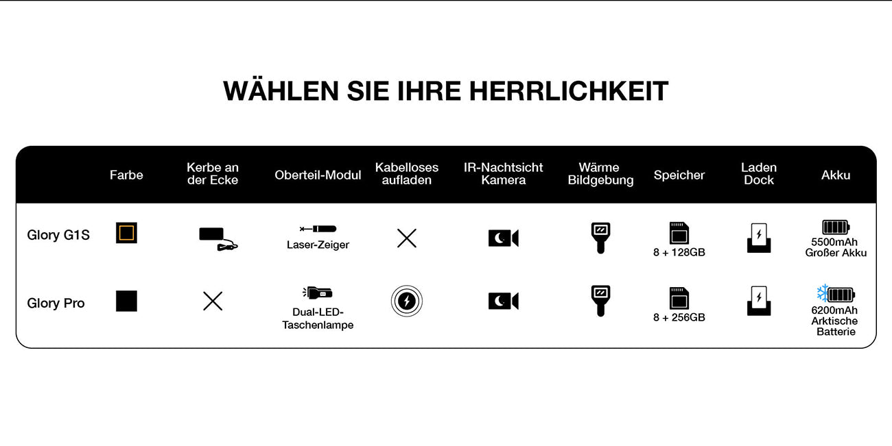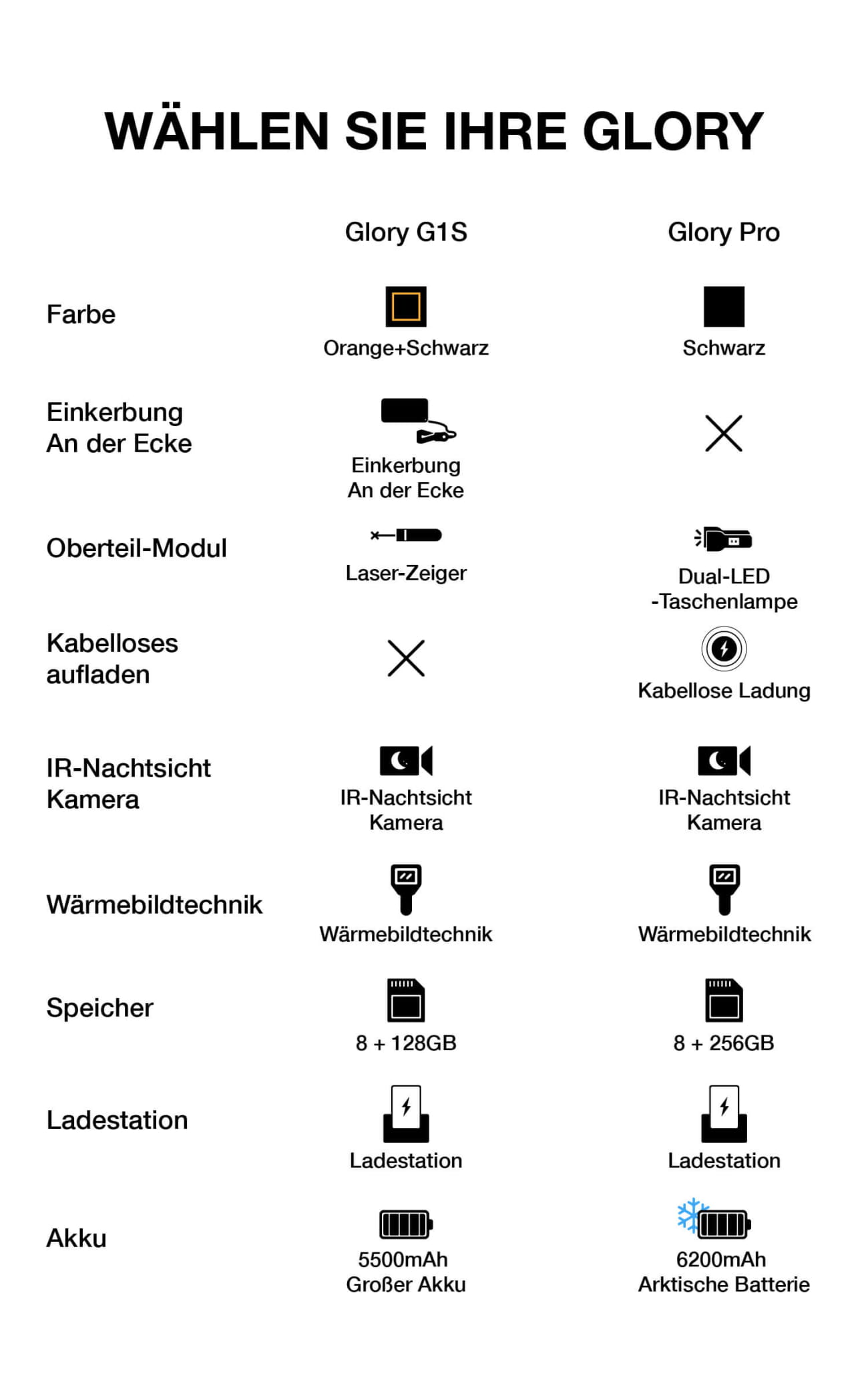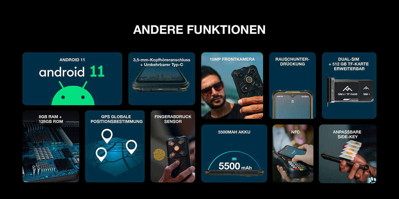 【6GB RAM +128GB ROM+Kabelloses Laden+5500mAh Akku】Mit 6GB RAM und 128GB ROM Speicher können Sie mehr Dateien speichern und eine 512GB-TF-Karte hinzufügen. AGM Glory G1S Robustes Handy Es ist mit einem 5500-mAh-Akku ausgestattet, sodass Sie sich im Freien keine Gedanken über die Akkulaufzeit machen müssen. Und auch seine Lademethoden sind sehr vielfältig: 18-W-Schnellladen, Cradle-Charging und kabelloses Laden.
