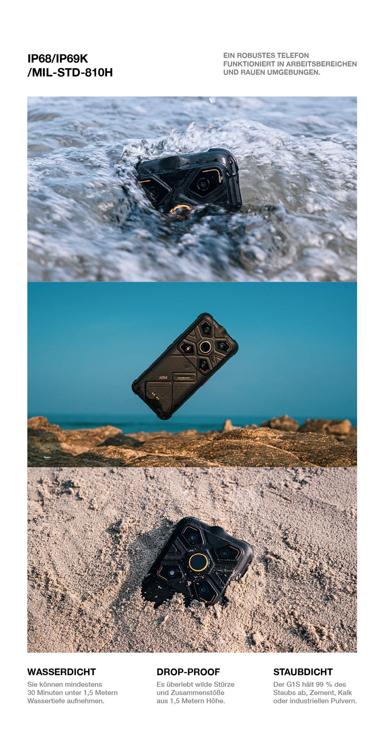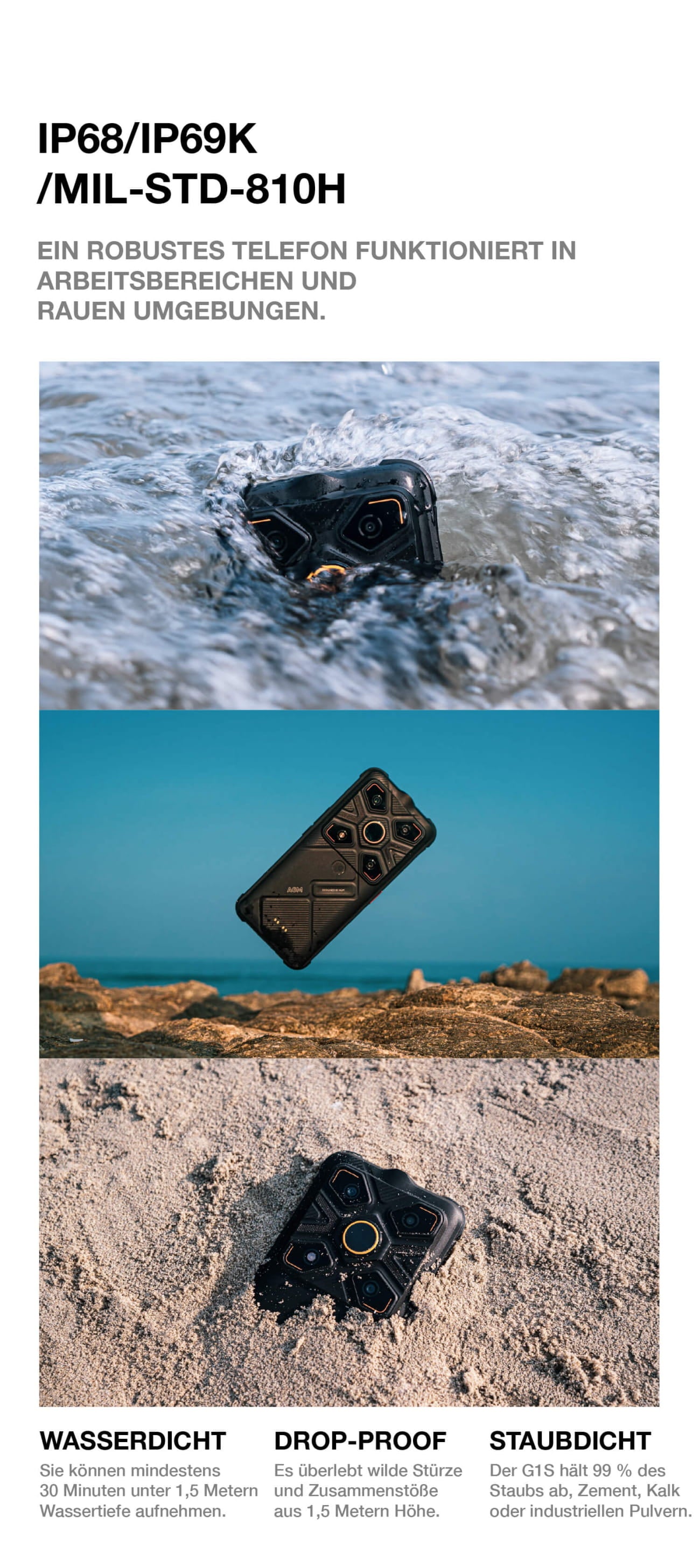 【IP68/IP69K/MIL-STD-810G Schutz nach Militärstandard】Das AGM Glory G1S Robustes Handy hat die strengste IP68/IP69k/MIL-STD-810H-Zertifizierung bestanden, es ist robust, sturzsicher, staubdicht und wasserdicht. Es widersteht Stürzen aus bis zu 1,5 m auf Beton und übersteht 30 Minuten unter 1,5 m Wasser, blockiert 99 % Staub, Zement, Kalk oder Industriepulver. Ein robustes Handy kann in einer Vielzahl von Arbeitsbereichen und rauen Umgebungen eingesetzt werden.